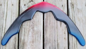 The Batwing! This design flies easy, has a nice hover, and is also easy to catch. This is a great boomerang for warming up the throwing arm, and also looks great as a decoration or conversation piece. The range is about 20 yards and it has a nice, climbing flight. Price - $27.95 About 13" across. |